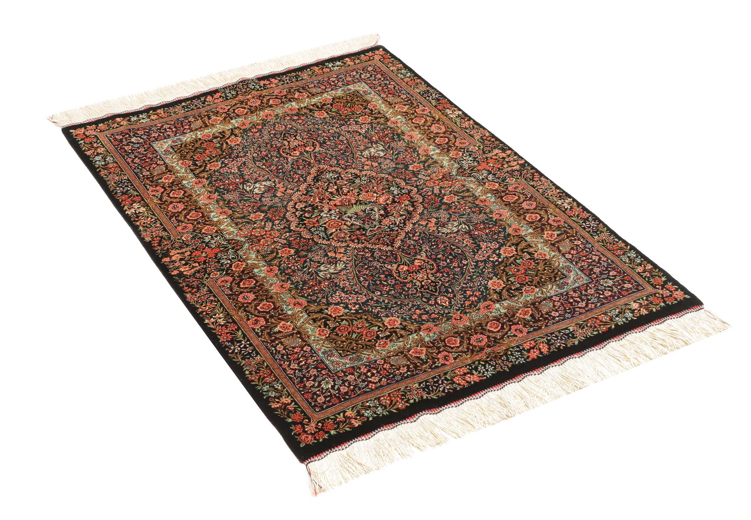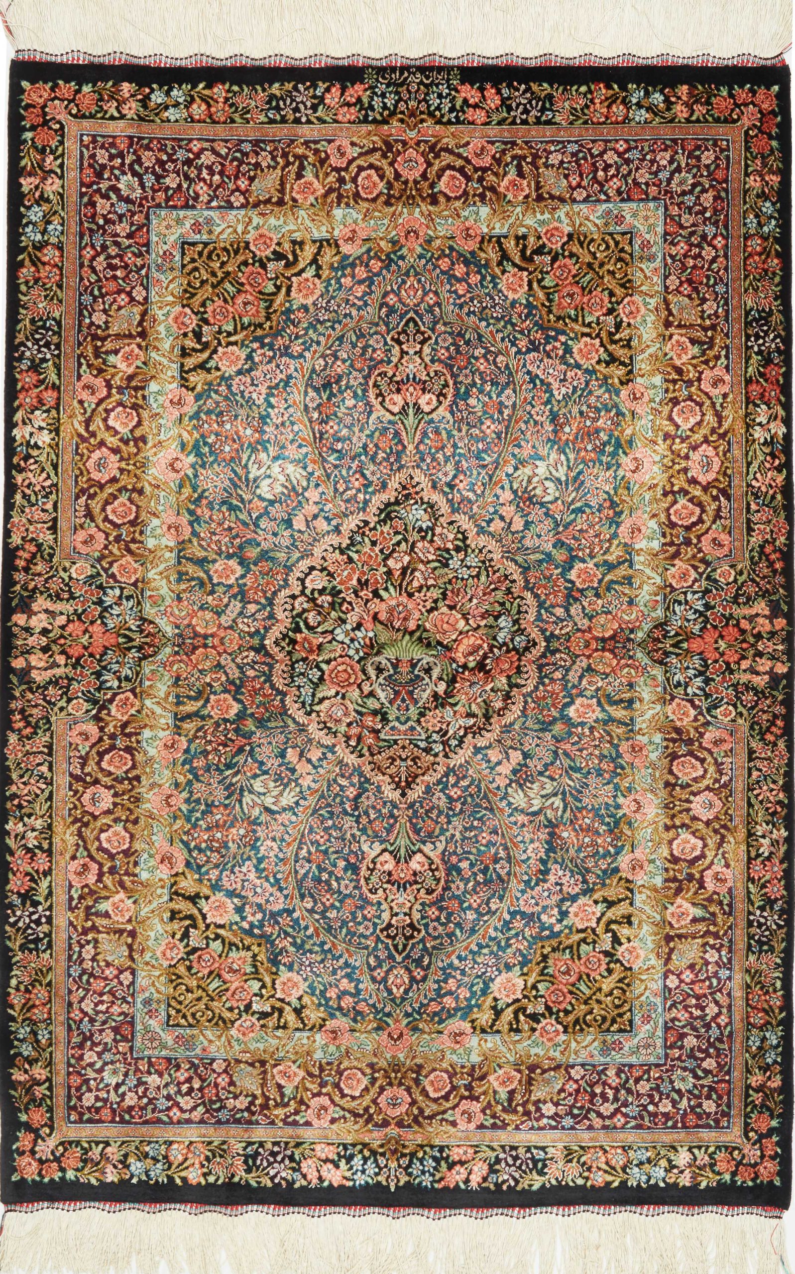 Ghom, a city of half a million people, lies south of Teheran, by the road to the Markazi (Central) province. The city’s rug industry was only developed after 1930 but has gained a good reputation. As there is no tradition or precedent to draw on, the weavers get their motifs from different sources, from where they transfer and combine them. Some patterns are completely copied and it is not uncommon to see copies of Joshqan or Sirjan rugs made in Ghom, but they much finer than the originals and made with a silk pile. In addition, several variations of medallions and uniform patterns are made. The pile is either silk with silk warp and weft, or wool, or wool mixed with silk, with a cotton base. The knotting is usually fine. A wide range of colours is used, sometimes in combinations that appear odd to westerners. A powerful pink and green is particularly characteristic of the silk rugs.