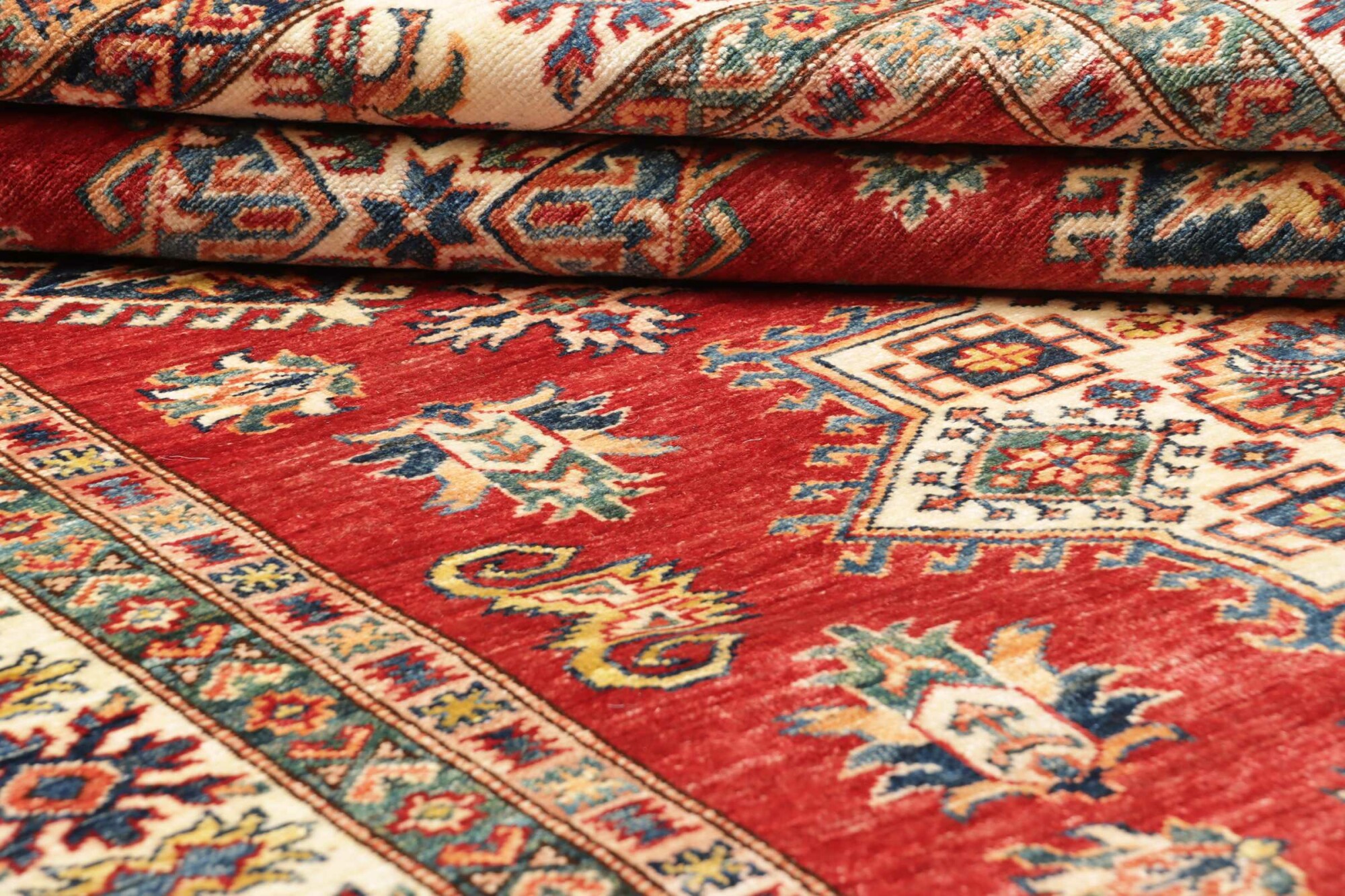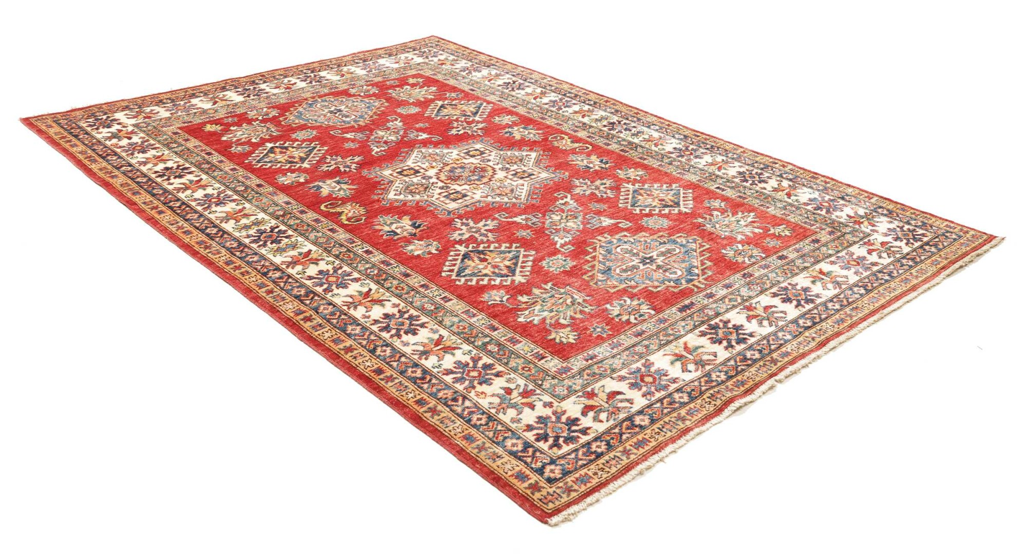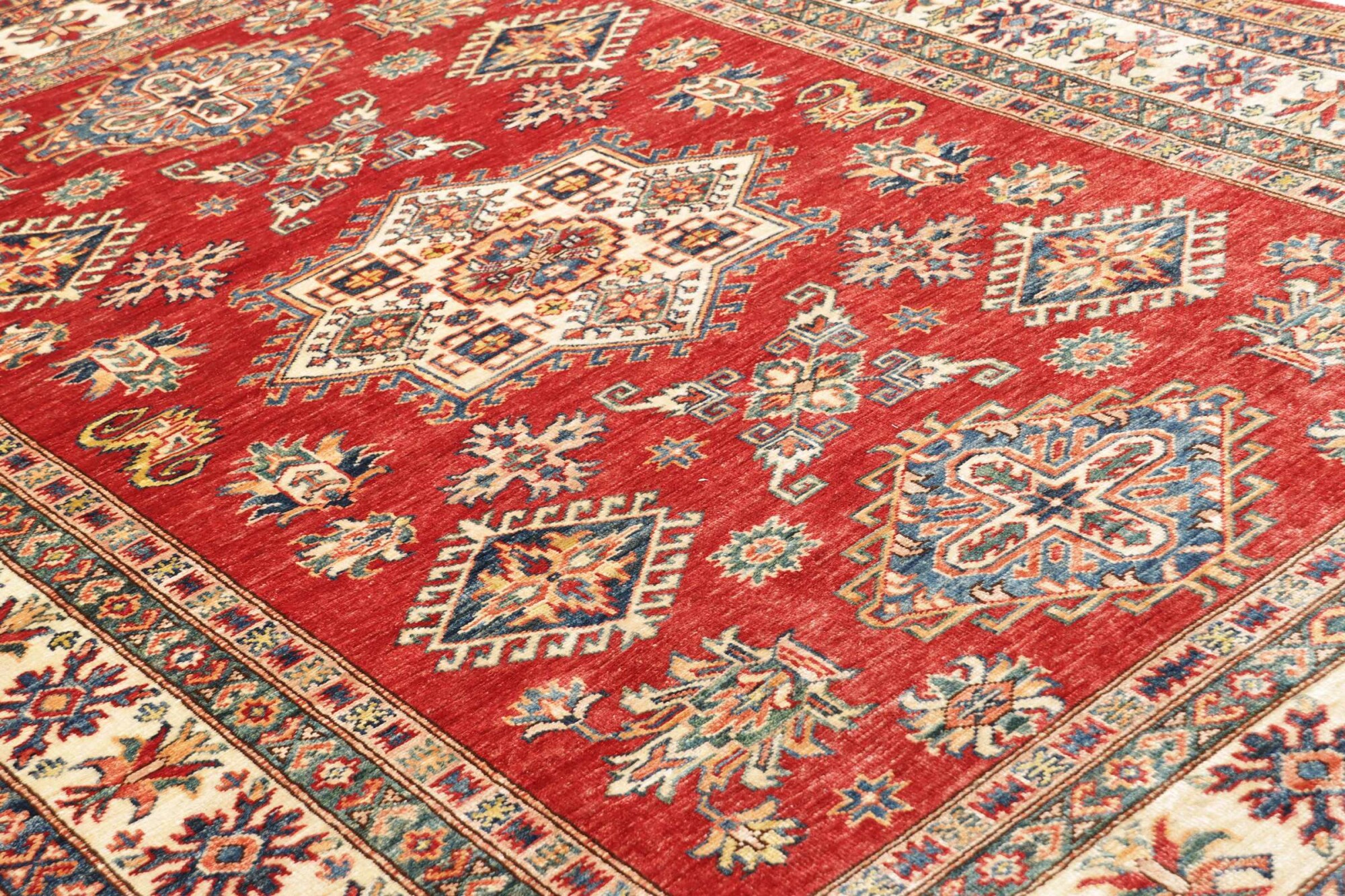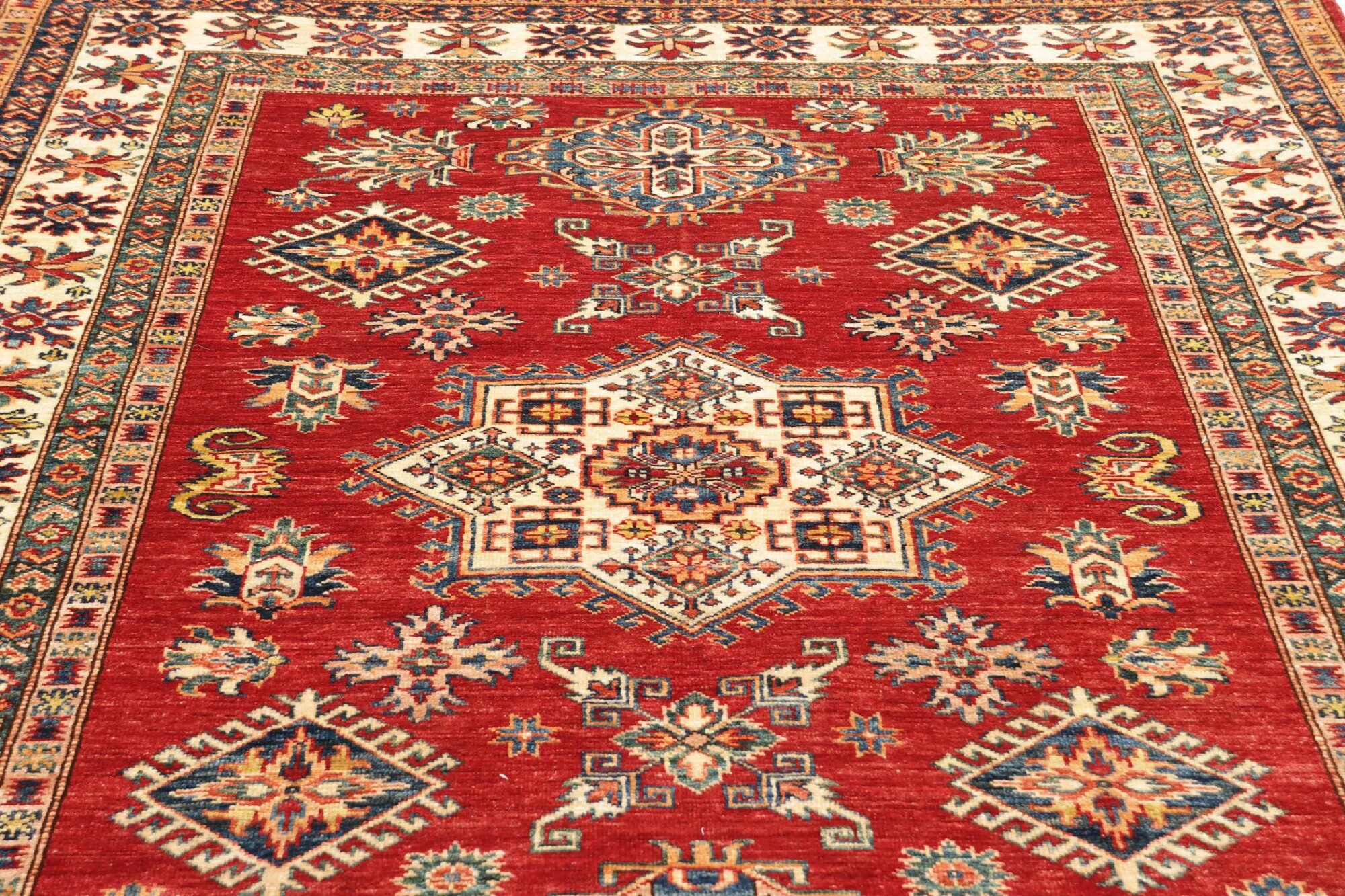 The Kazak rugs are an Armenian type of rug knotted in southern Caucasus, between Tiflis and Erevan. The rugs are handwoven rugs known for their bold, geometric patterns and vibrant colors. Crafted from high-quality wool, they feature traditional motifs and rich designs that bring warmth and character to any space. Ideal for adding a touch of cultural elegance and lasting beauty to any home. The patterns are geometrical and the wool is coloured using natural plant pigments. The rugs are very durable and are stonewashed to get their special, shining look. The Kezak rugs, as well as other Armenian rugs, are traditionally a status symbol, and were originally placed in palaces, churches, and in the homes of the wealthy.