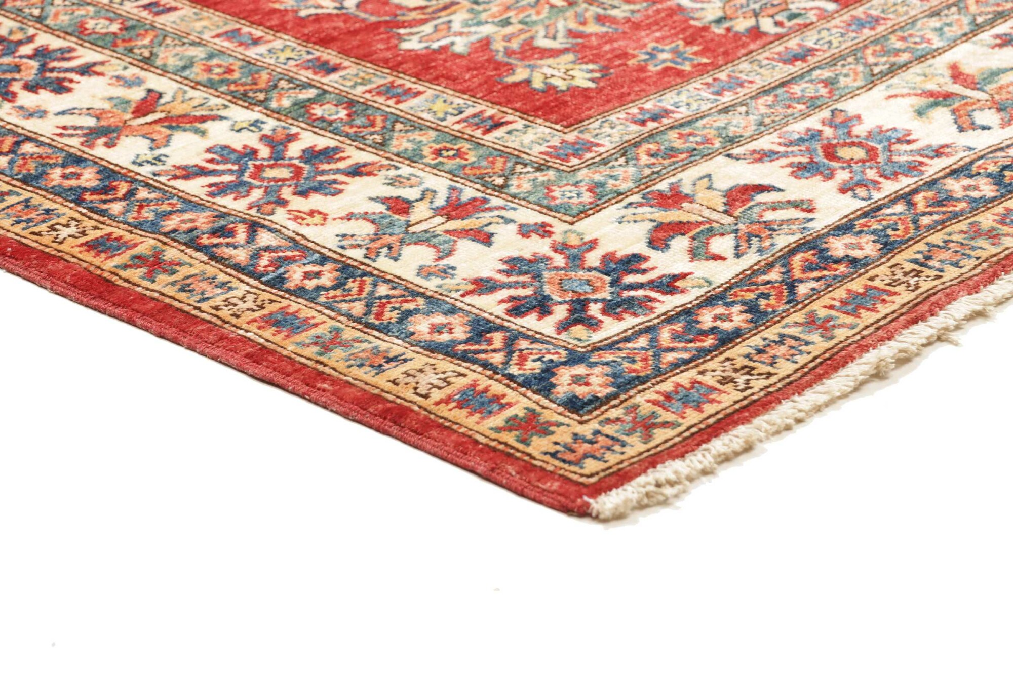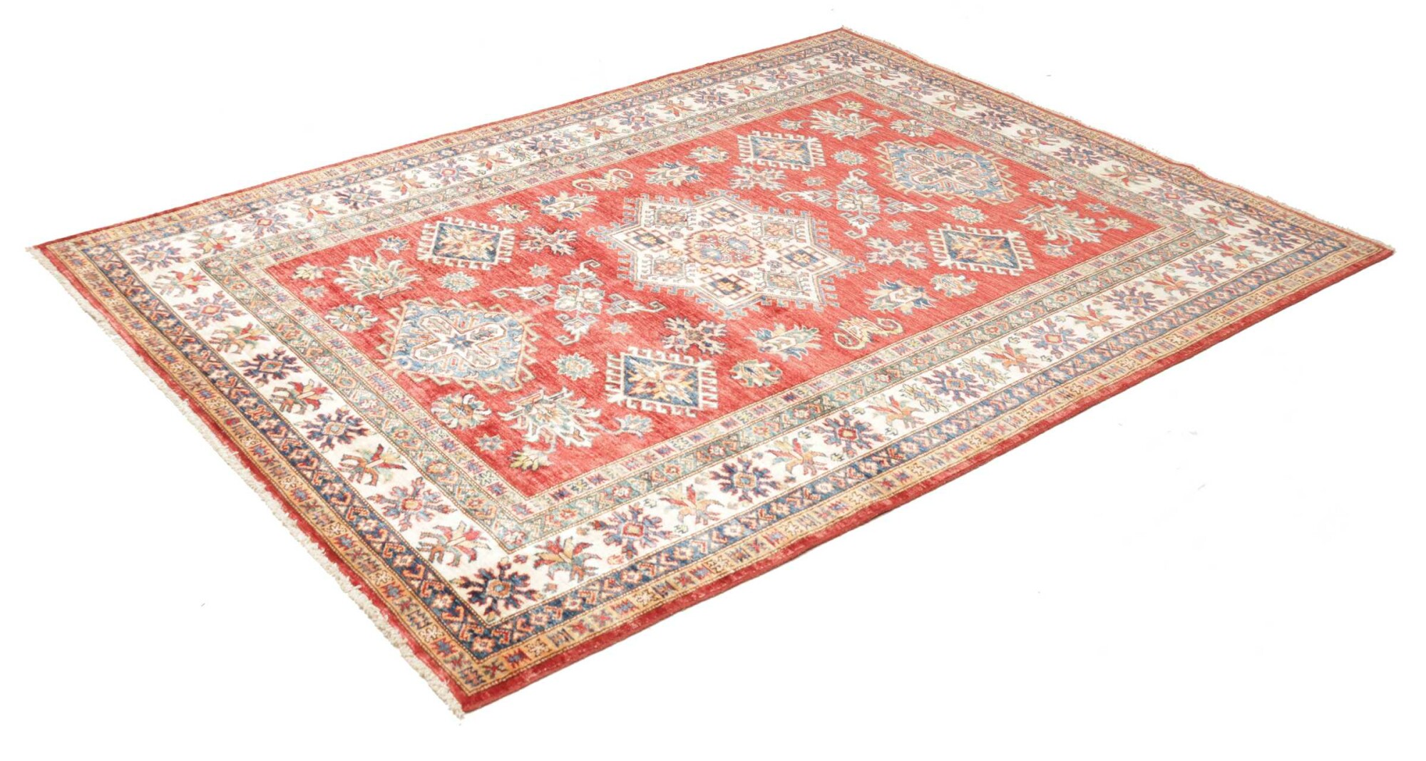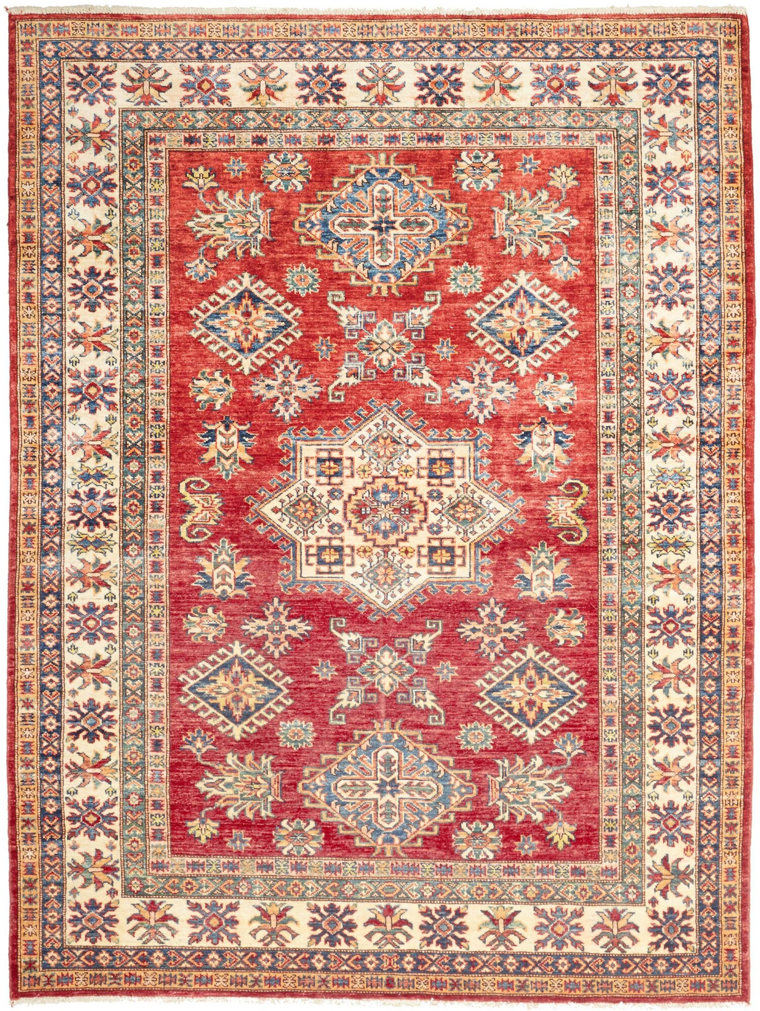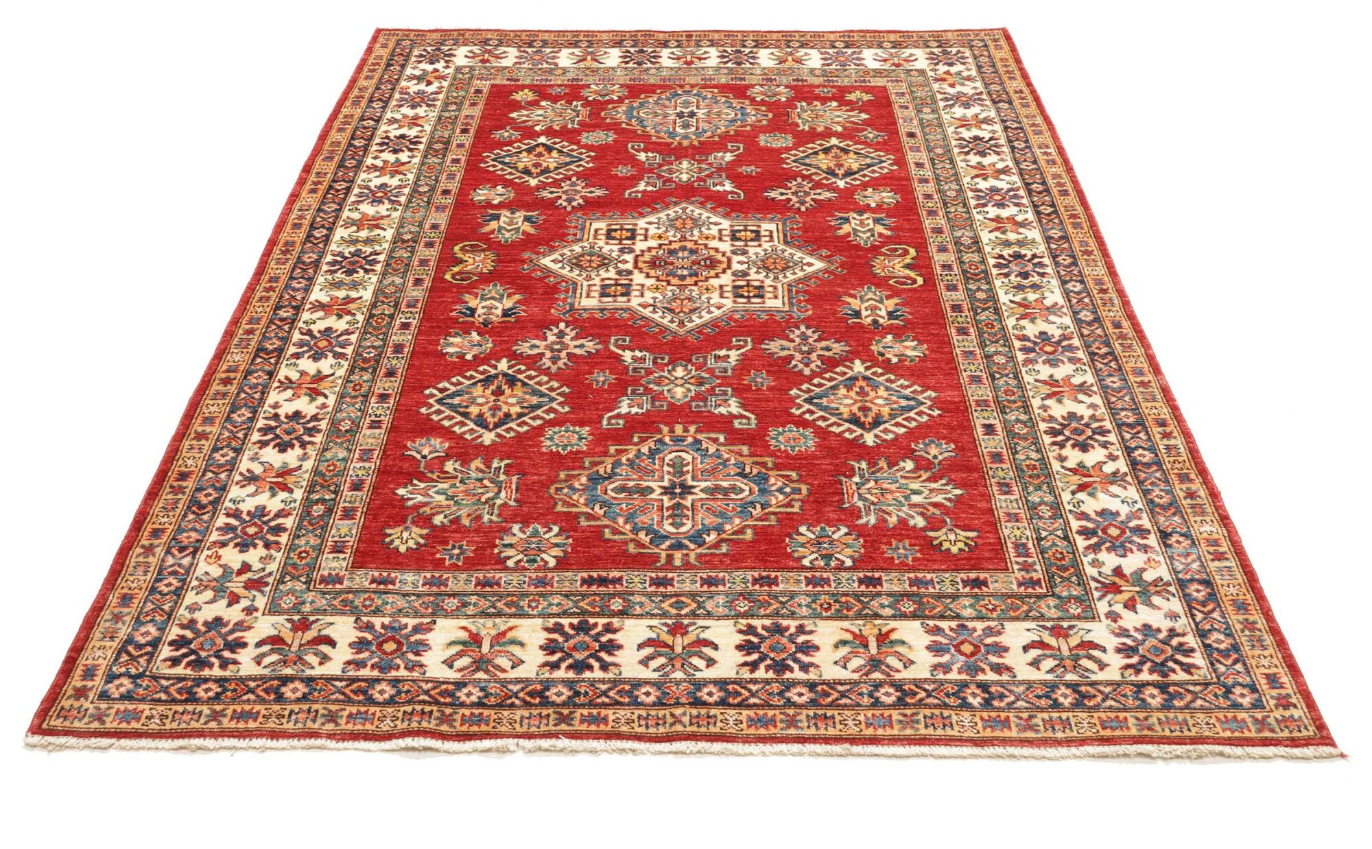 The Kazak rugs are an Armenian type of rug knotted in southern Caucasus, between Tiflis and Erevan. The rugs are handwoven rugs known for their bold, geometric patterns and vibrant colors. Crafted from high-quality wool, they feature traditional motifs and rich designs that bring warmth and character to any space. Ideal for adding a touch of cultural elegance and lasting beauty to any home. The patterns are geometrical and the wool is coloured using natural plant pigments. The rugs are very durable and are stonewashed to get their special, shining look. The Kezak rugs, as well as other Armenian rugs, are traditionally a status symbol, and were originally placed in palaces, churches, and in the homes of the wealthy.