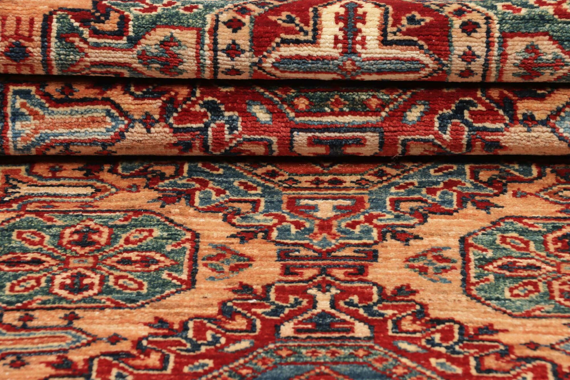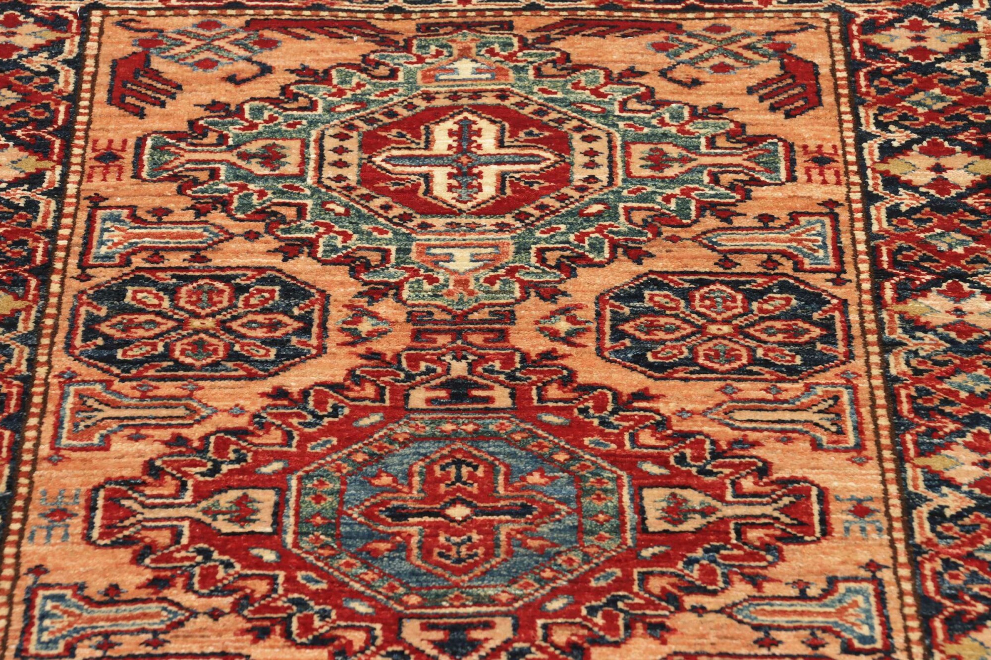 The Kazak rugs are an Armenian type of rug knotted in southern Caucasus, between Tiflis and Erevan. The rugs are handwoven rugs known for their bold, geometric patterns and vibrant colors. Crafted from high-quality wool, they feature traditional motifs and rich designs that bring warmth and character to any space. Ideal for adding a touch of cultural elegance and lasting beauty to any home. The patterns are geometrical and the wool is coloured using natural plant pigments. The rugs are very durable and are stonewashed to get their special, shining look. The Kezak rugs, as well as other Armenian rugs, are traditionally a status symbol, and were originally placed in palaces, churches, and in the homes of the wealthy.