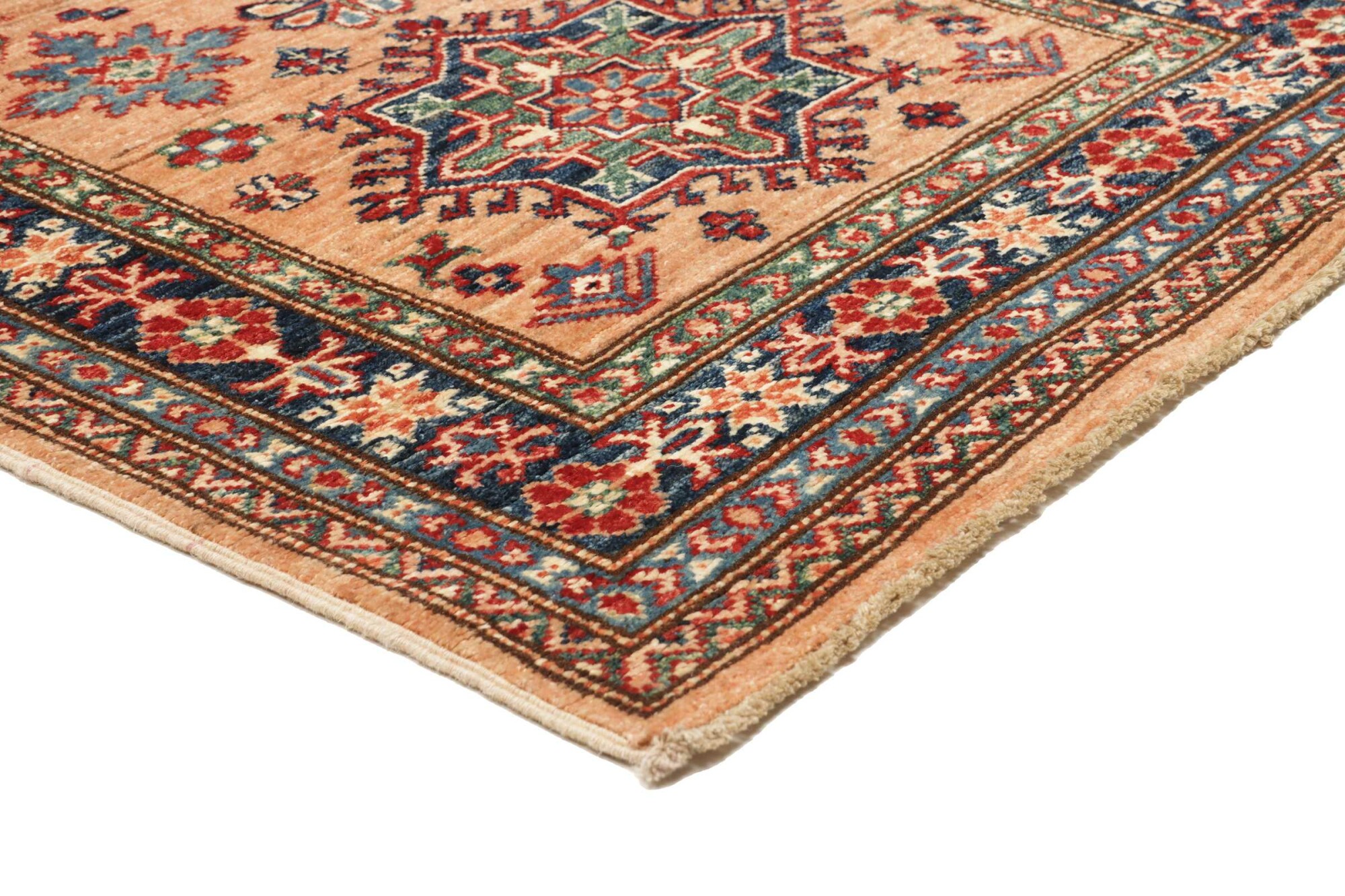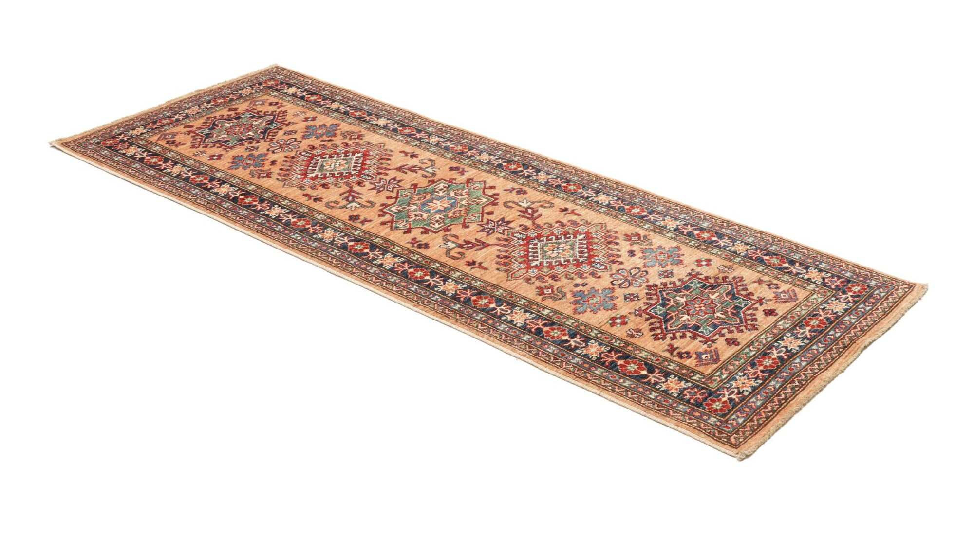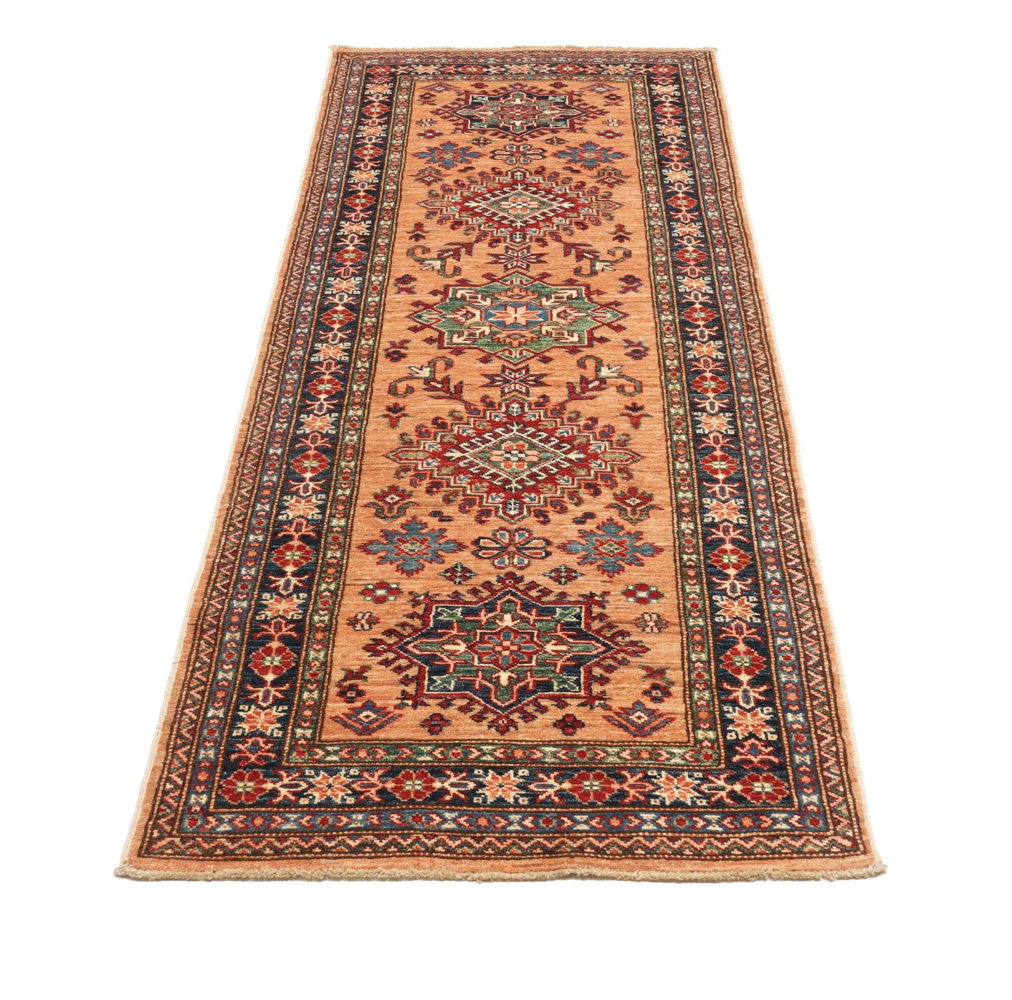 The Kazak rugs are an Armenian type of rug knotted in southern Caucasus, between Tiflis and Erevan. The rugs are handwoven rugs known for their bold, geometric patterns and vibrant colors. Crafted from high-quality wool, they feature traditional motifs and rich designs that bring warmth and character to any space. Ideal for adding a touch of cultural elegance and lasting beauty to any home. The patterns are geometrical and the wool is coloured using natural plant pigments. The rugs are very durable and are stonewashed to get their special, shining look. The Kezak rugs, as well as other Armenian rugs, are traditionally a status symbol, and were originally placed in palaces, churches, and in the homes of the wealthy.