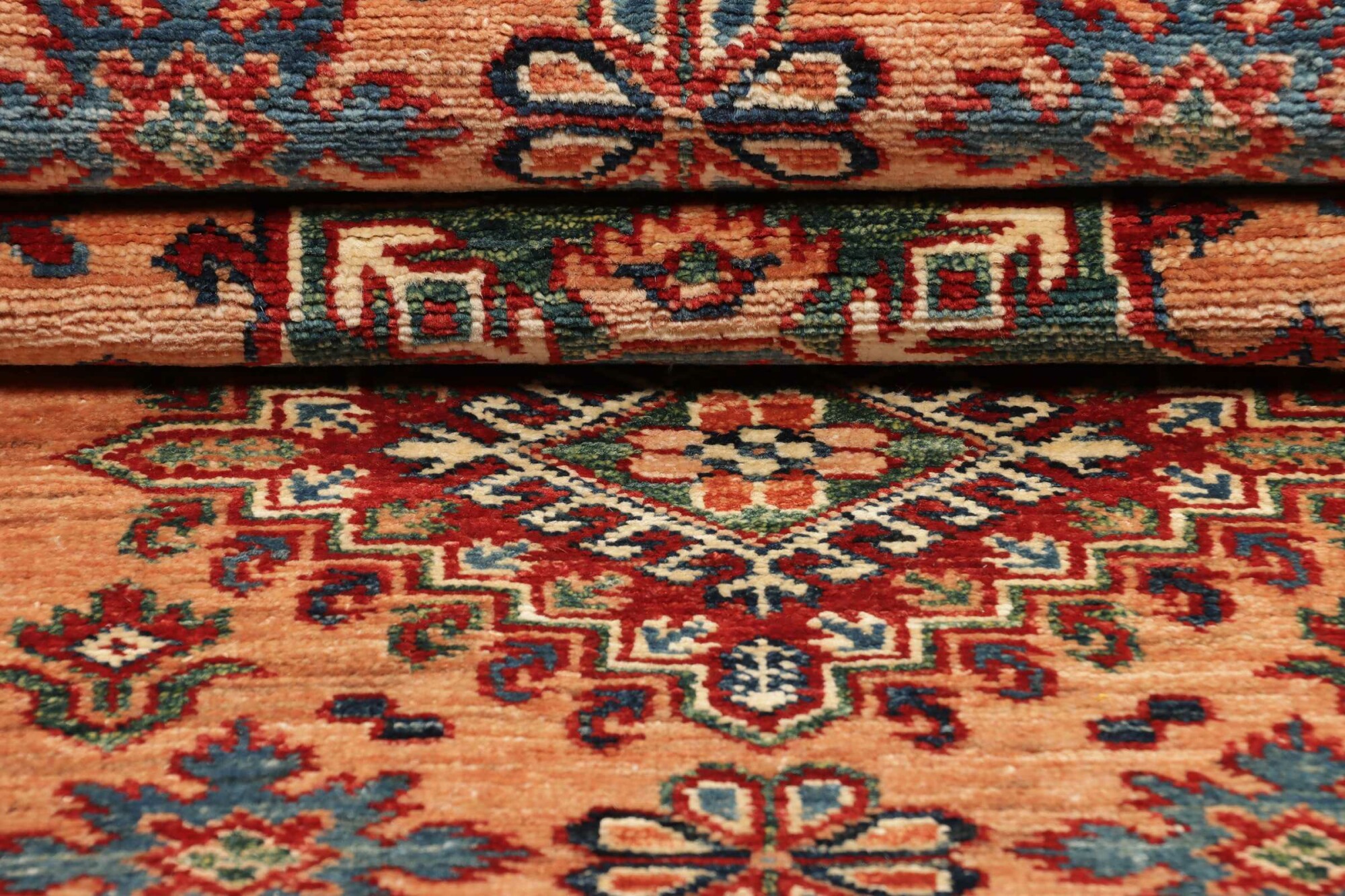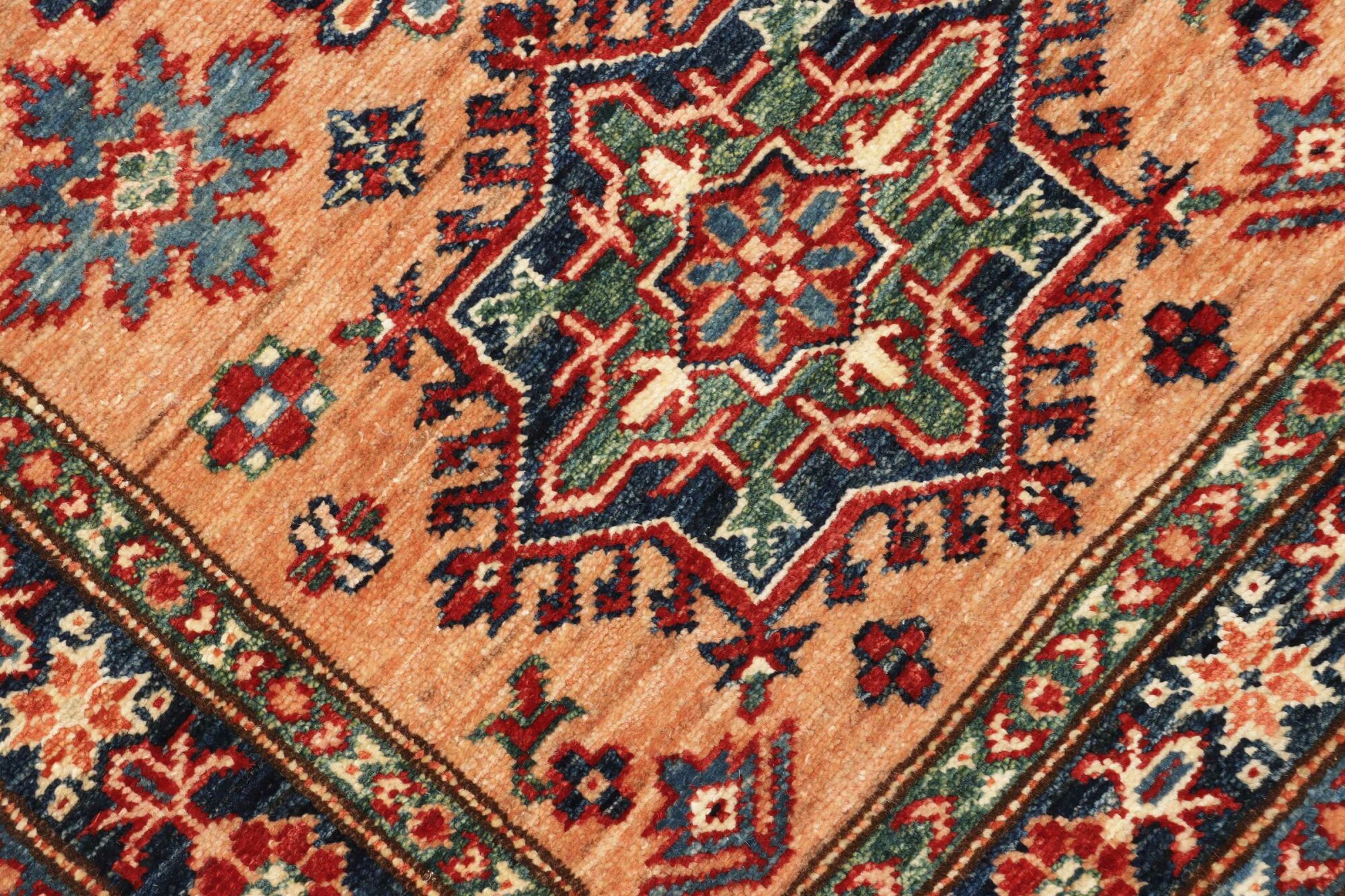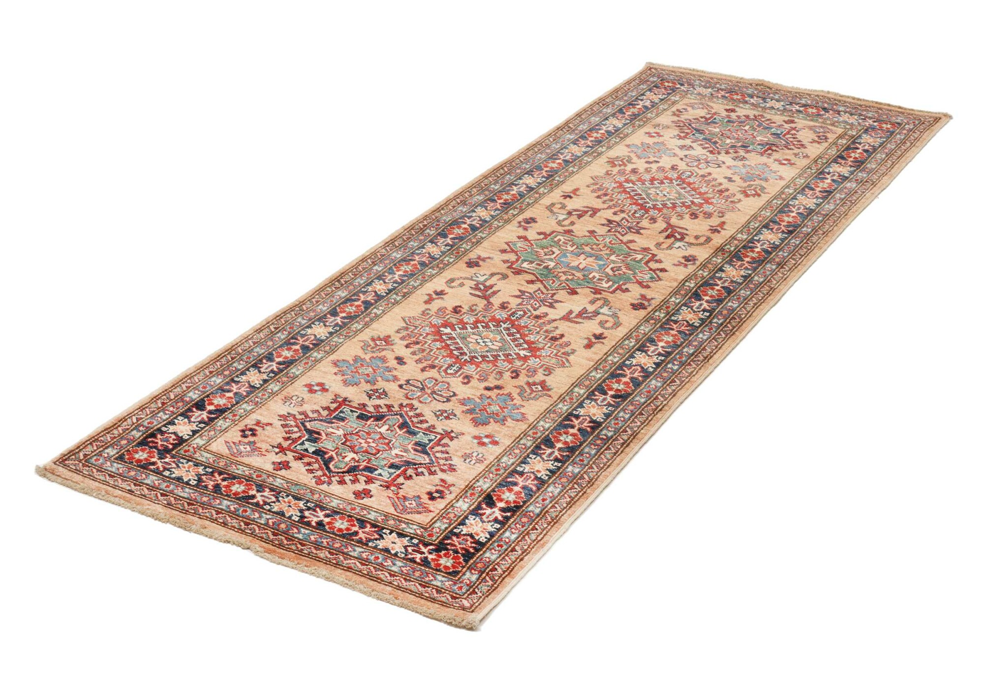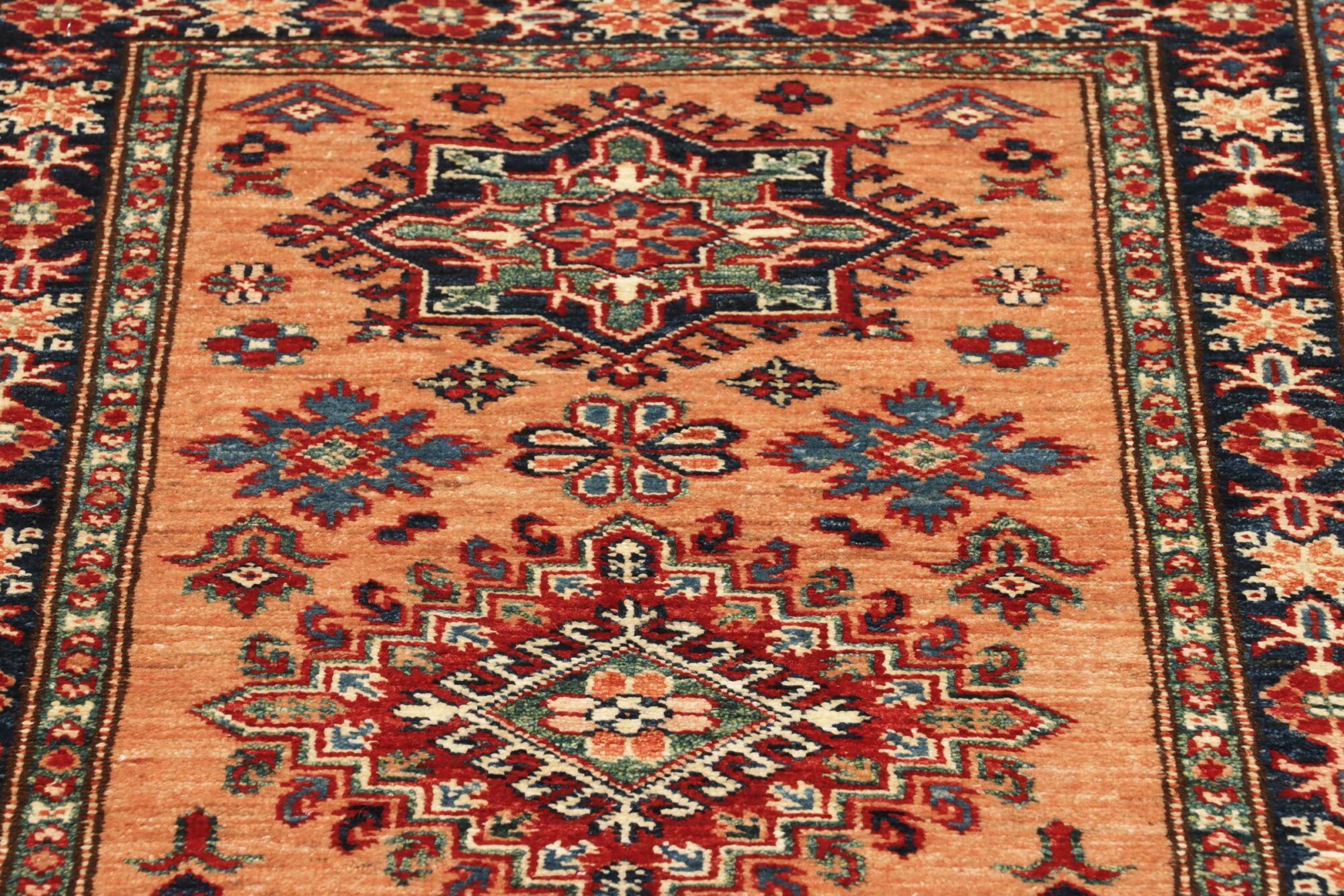 The Kazak rugs are an Armenian type of rug knotted in southern Caucasus, between Tiflis and Erevan. The rugs are handwoven rugs known for their bold, geometric patterns and vibrant colors. Crafted from high-quality wool, they feature traditional motifs and rich designs that bring warmth and character to any space. Ideal for adding a touch of cultural elegance and lasting beauty to any home. The patterns are geometrical and the wool is coloured using natural plant pigments. The rugs are very durable and are stonewashed to get their special, shining look. The Kezak rugs, as well as other Armenian rugs, are traditionally a status symbol, and were originally placed in palaces, churches, and in the homes of the wealthy.