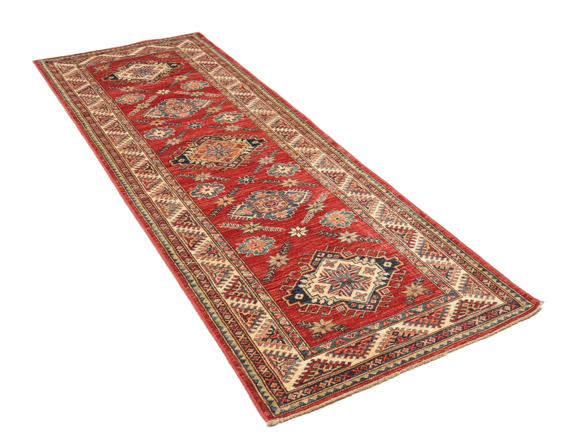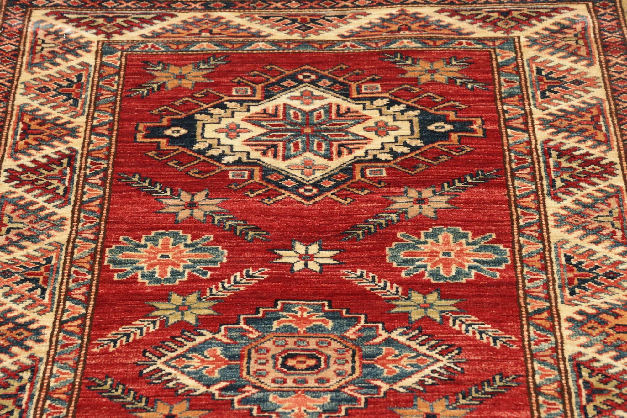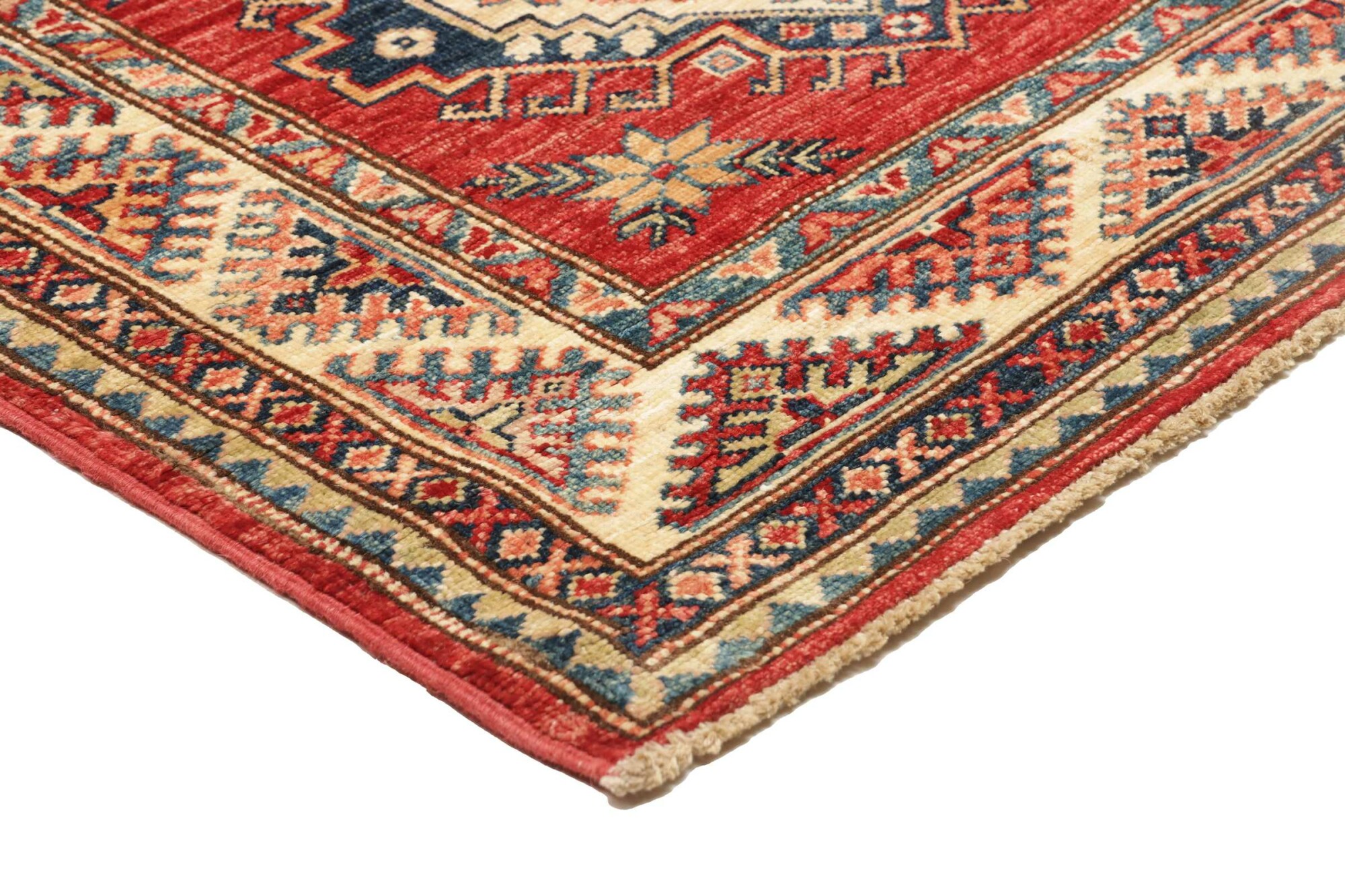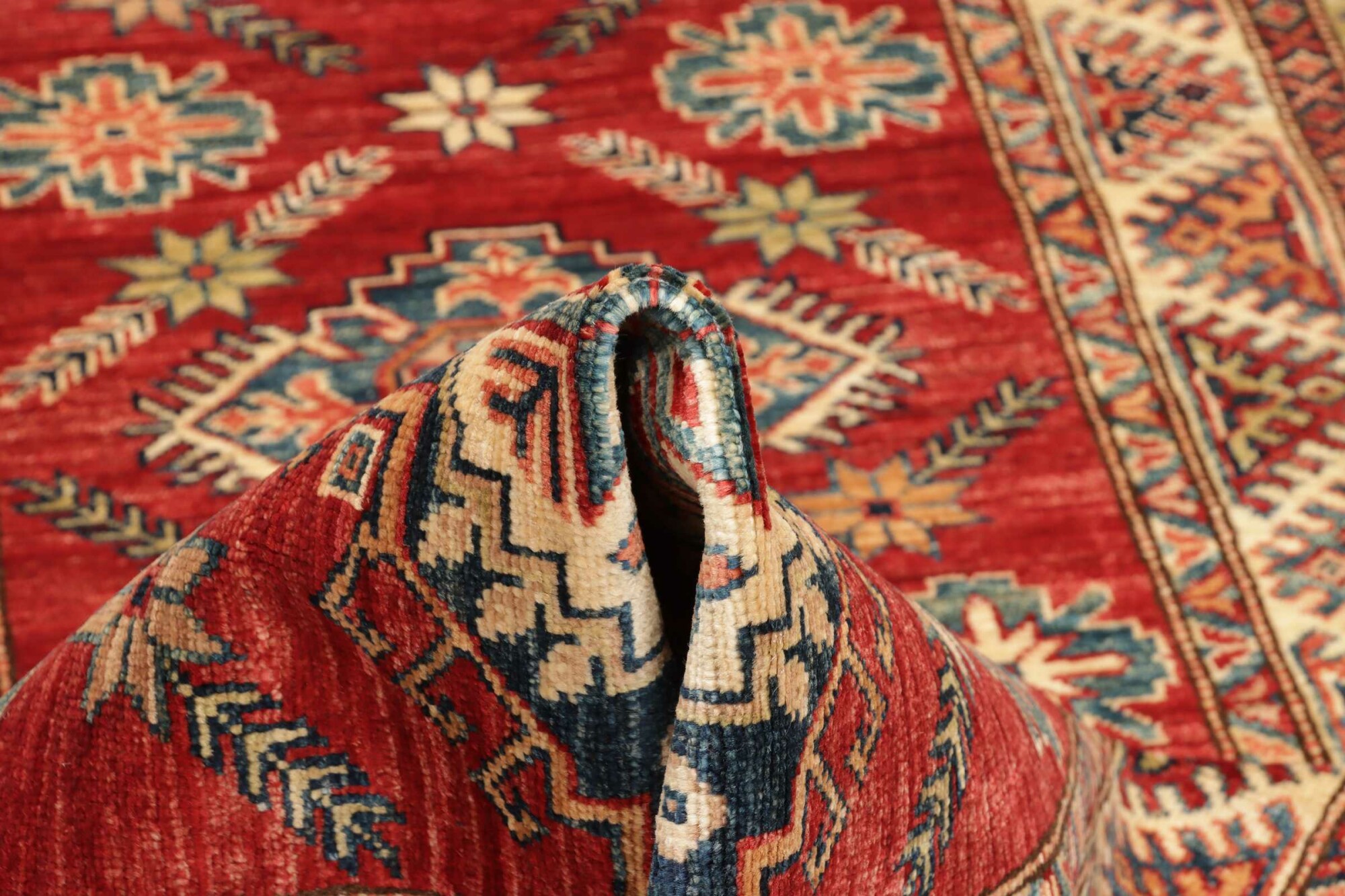 The Kazak rugs are an Armenian type of rug knotted in southern Caucasus, between Tiflis and Erevan. The rugs are handwoven rugs known for their bold, geometric patterns and vibrant colors. Crafted from high-quality wool, they feature traditional motifs and rich designs that bring warmth and character to any space. Ideal for adding a touch of cultural elegance and lasting beauty to any home. The patterns are geometrical and the wool is coloured using natural plant pigments. The rugs are very durable and are stonewashed to get their special, shining look. The Kezak rugs, as well as other Armenian rugs, are traditionally a status symbol, and were originally placed in palaces, churches, and in the homes of the wealthy.