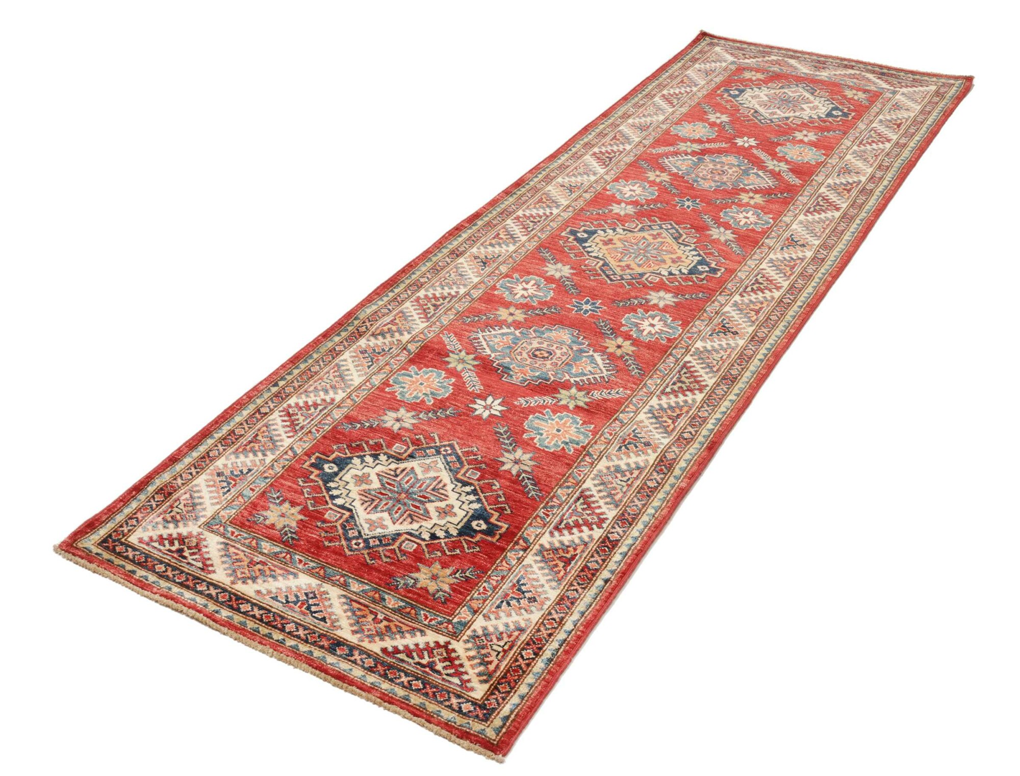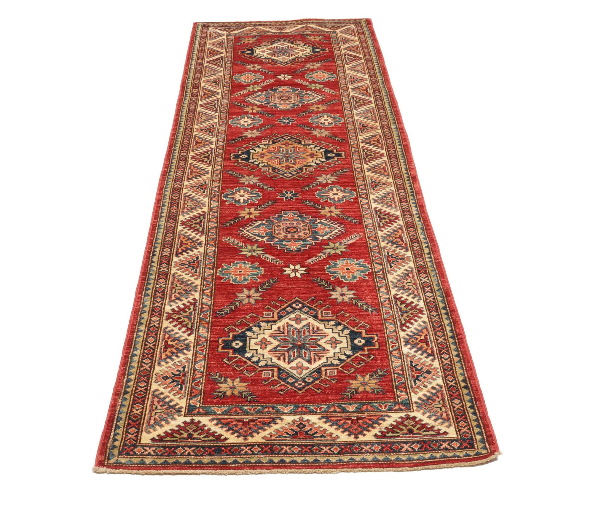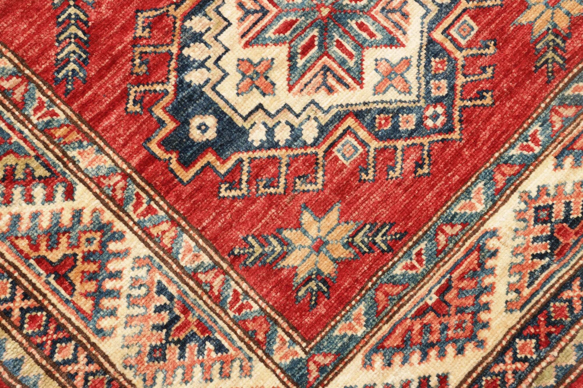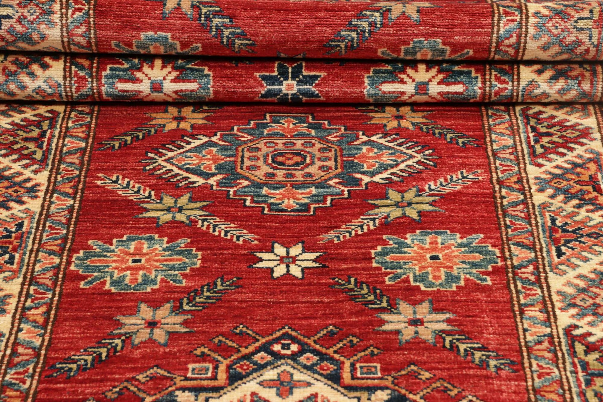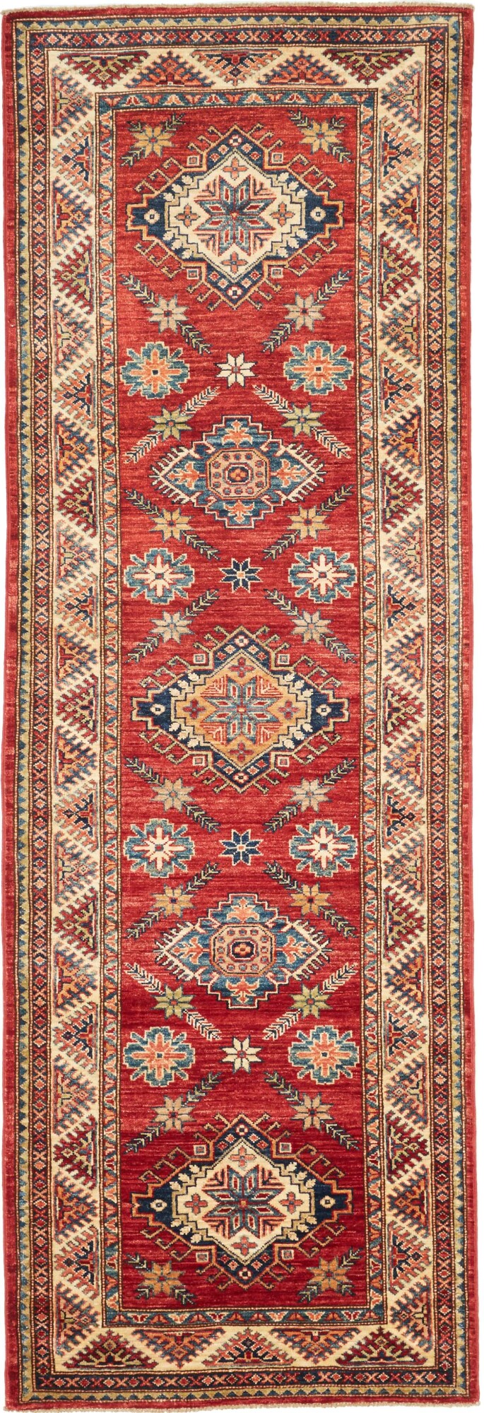The Kazak rugs are an Armenian type of rug knotted in southern Caucasus, between Tiflis and Erevan. The rugs are handwoven rugs known for their bold, geometric patterns and vibrant colors. Crafted from high-quality wool, they feature traditional motifs and rich designs that bring warmth and character to any space. Ideal for adding a touch of cultural elegance and lasting beauty to any home. The patterns are geometrical and the wool is coloured using natural plant pigments. The rugs are very durable and are stonewashed to get their special, shining look. The Kezak rugs, as well as other Armenian rugs, are traditionally a status symbol, and were originally placed in palaces, churches, and in the homes of the wealthy.