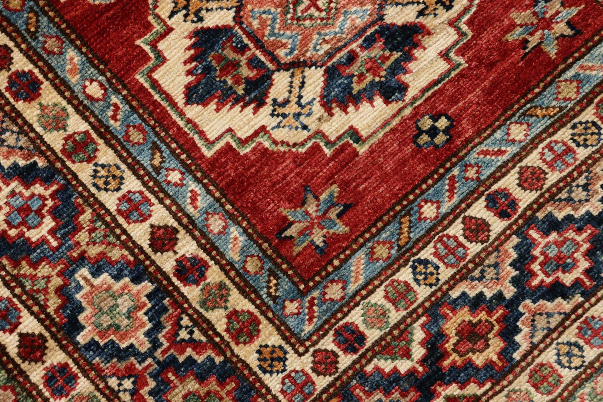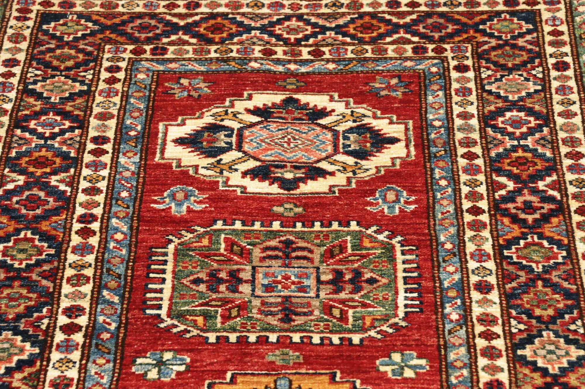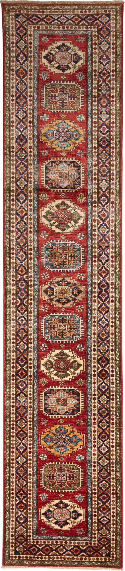 The Kazak rugs are an Armenian type of rug knotted in southern Caucasus, between Tiflis and Erevan. The rugs are handwoven rugs known for their bold, geometric patterns and vibrant colors. Crafted from high-quality wool, they feature traditional motifs and rich designs that bring warmth and character to any space. Ideal for adding a touch of cultural elegance and lasting beauty to any home. The patterns are geometrical and the wool is coloured using natural plant pigments. The rugs are very durable and are stonewashed to get their special, shining look. The Kezak rugs, as well as other Armenian rugs, are traditionally a status symbol, and were originally placed in palaces, churches, and in the homes of the wealthy.