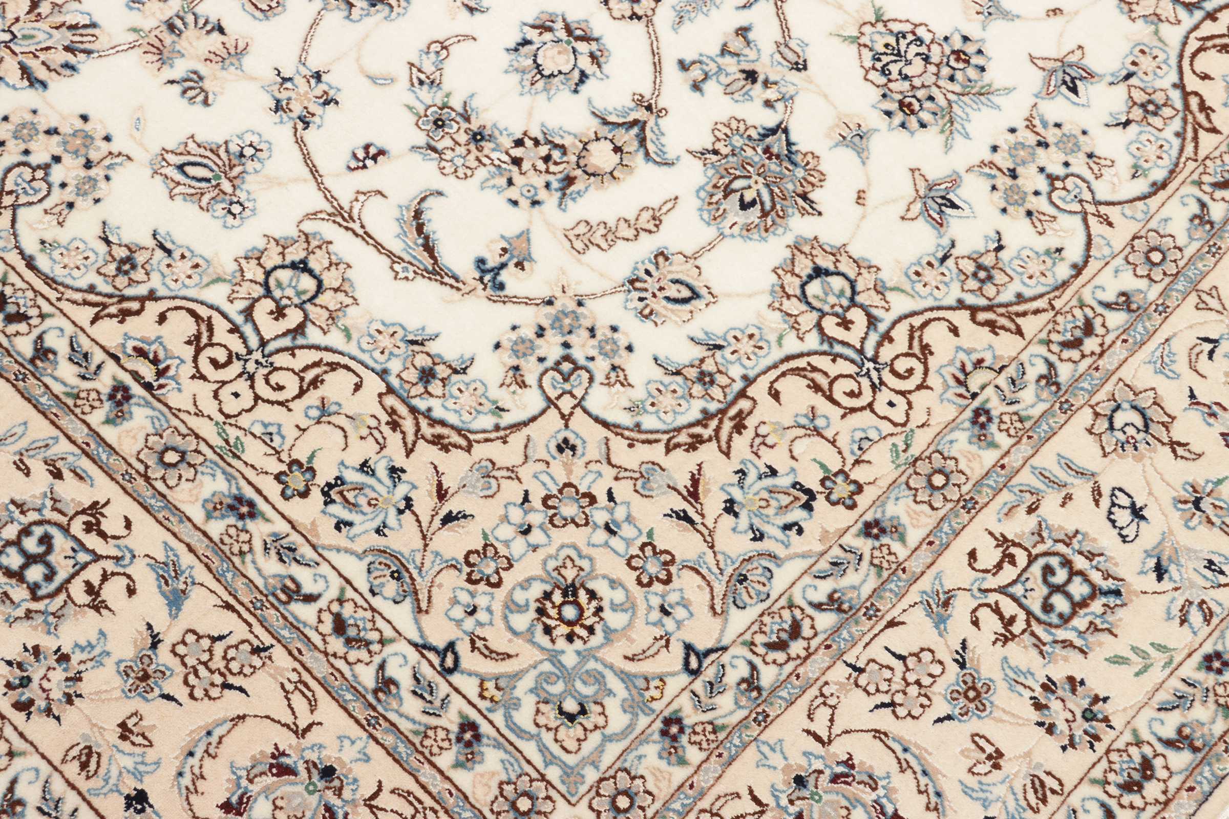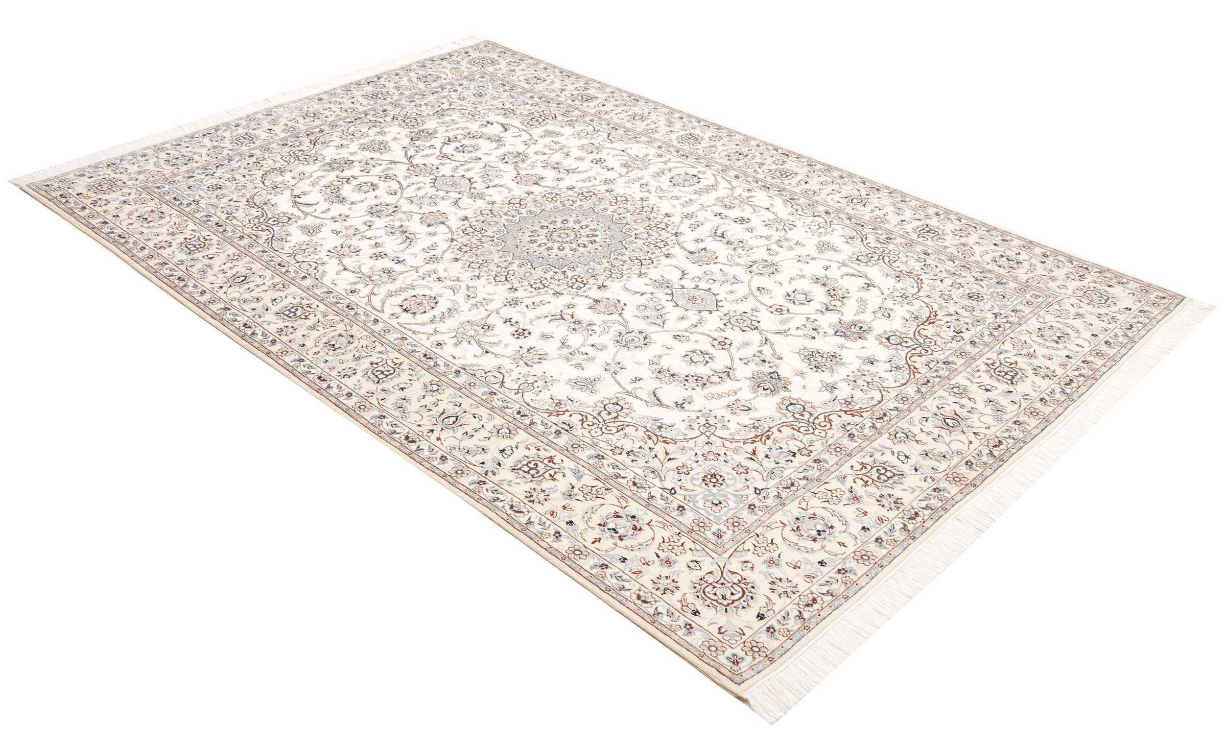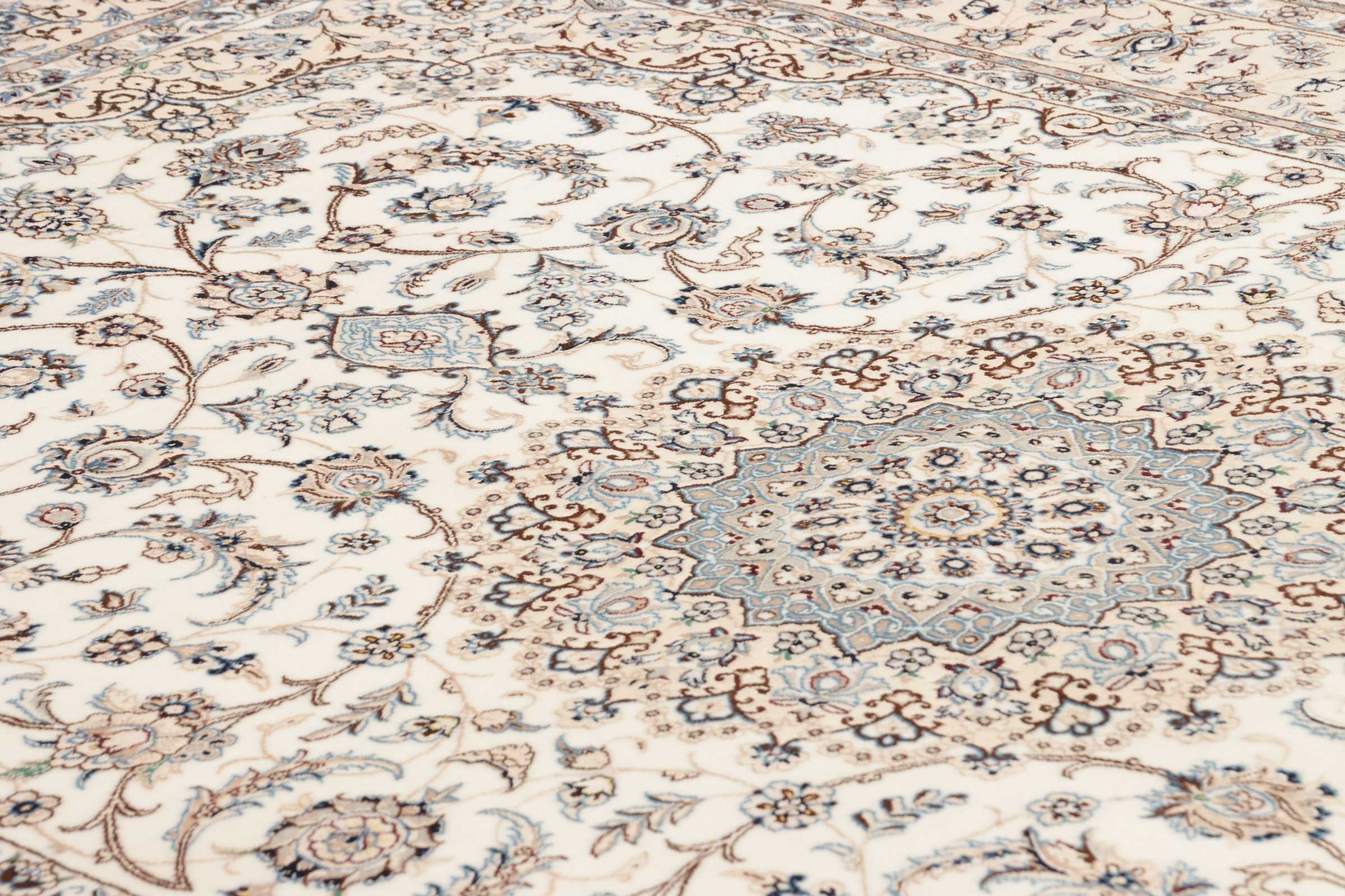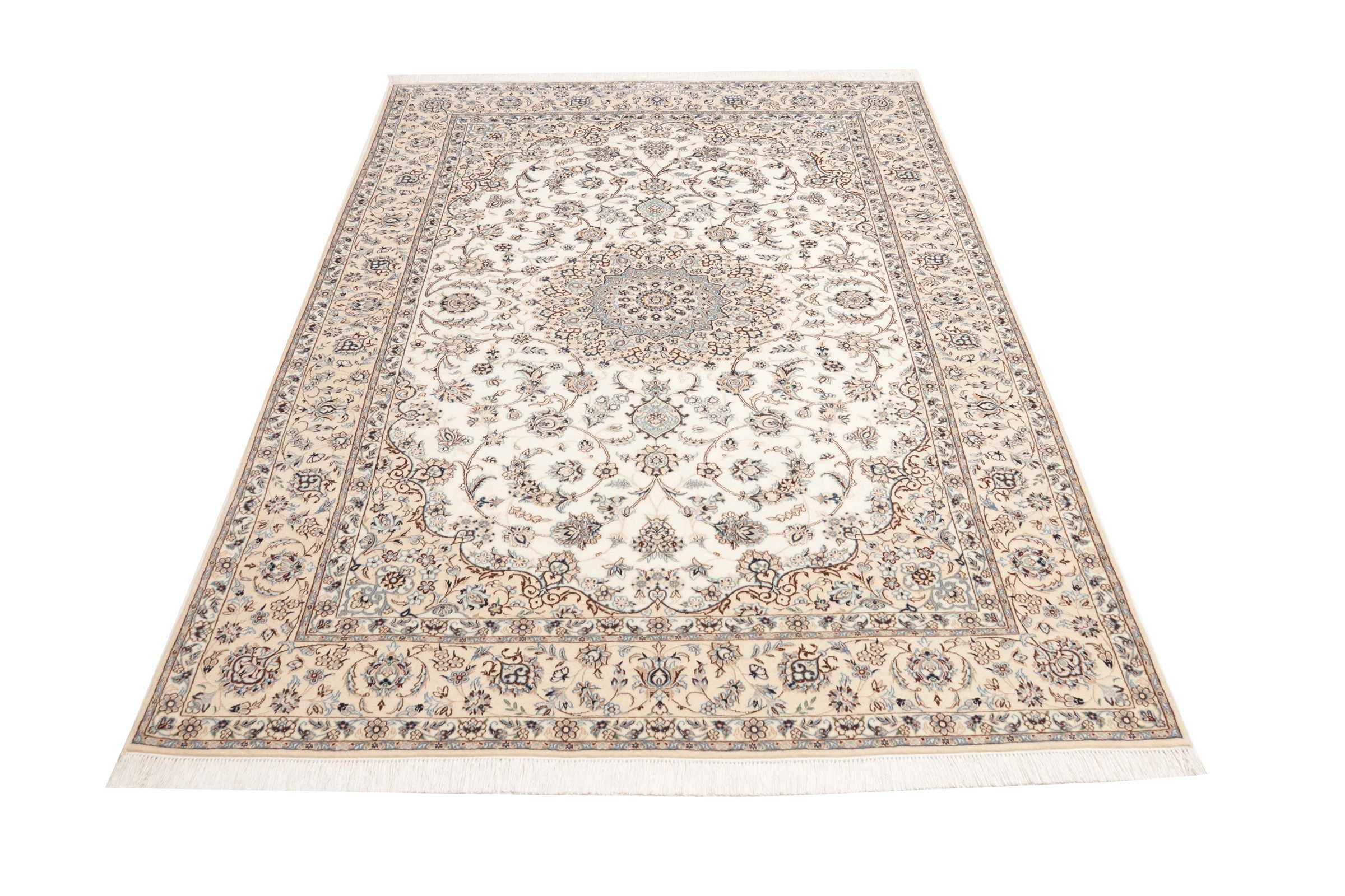 Nain carpets are high-quality Persian rugs woven in the Nain region of Iran. Known for their intricate designs, these carpets feature fine details, often incorporating floral and medallion patterns. Made from premium wool or silk, Nain carpets are prized for their elegance, durability, and smooth texture.