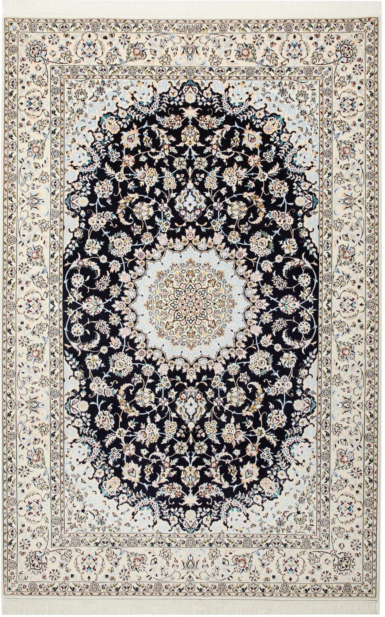 Nain carpets are high-quality Persian rugs woven in the Nain region of Iran. Known for their intricate designs, these carpets feature fine details, often incorporating floral and medallion patterns. Made from premium wool or silk, Nain carpets are prized for their elegance, durability, and smooth texture.