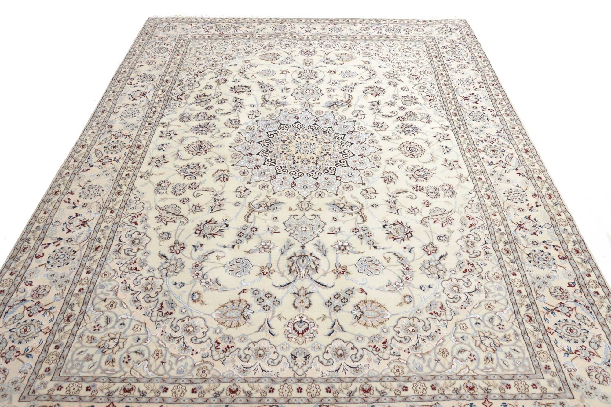 Nain carpets are high-quality Persian rugs woven in the Nain region of Iran. Known for their intricate designs, these carpets feature fine details, often incorporating floral and medallion patterns. Made from premium wool or silk, Nain carpets are prized for their elegance, durability, and smooth texture.