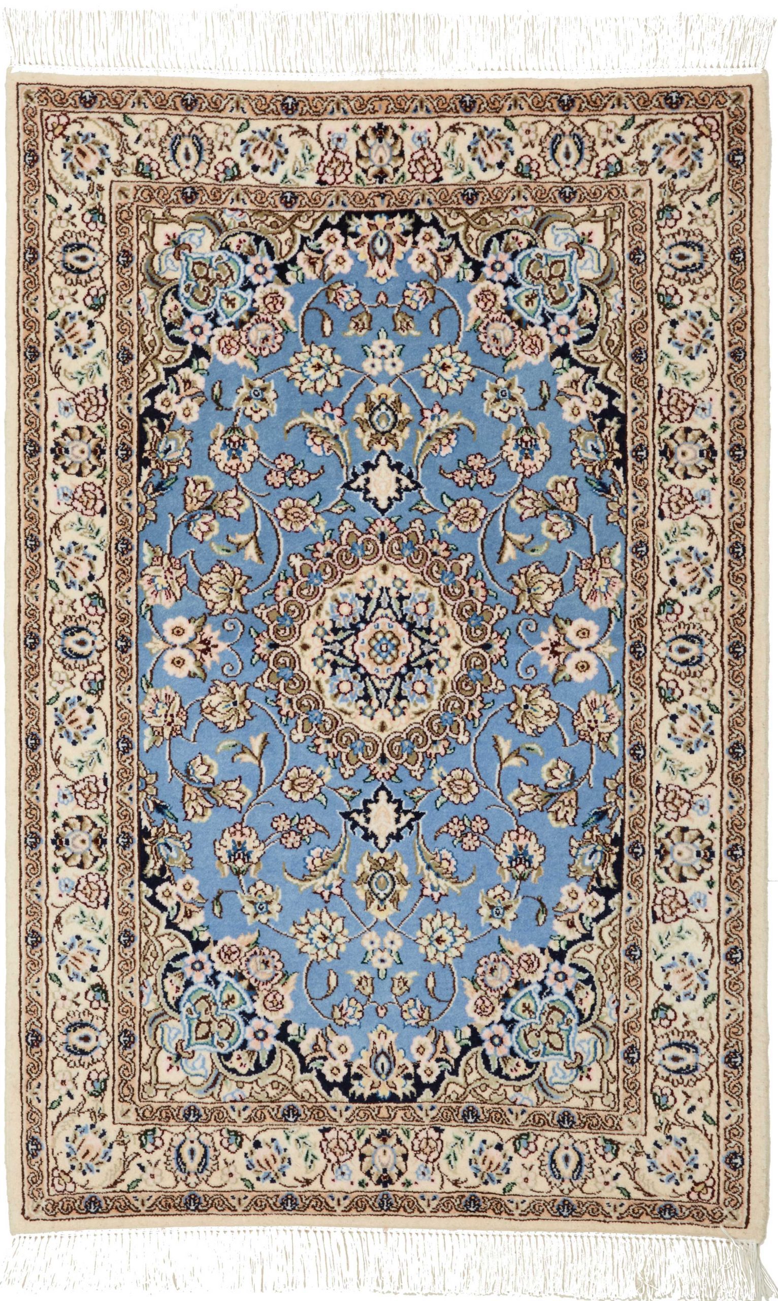 Nain carpets are high-quality Persian rugs woven in the Nain region of Iran. Known for their intricate designs, these carpets feature fine details, often incorporating floral and medallion patterns. Made from premium wool or silk, Nain carpets are prized for their elegance, durability, and smooth texture.