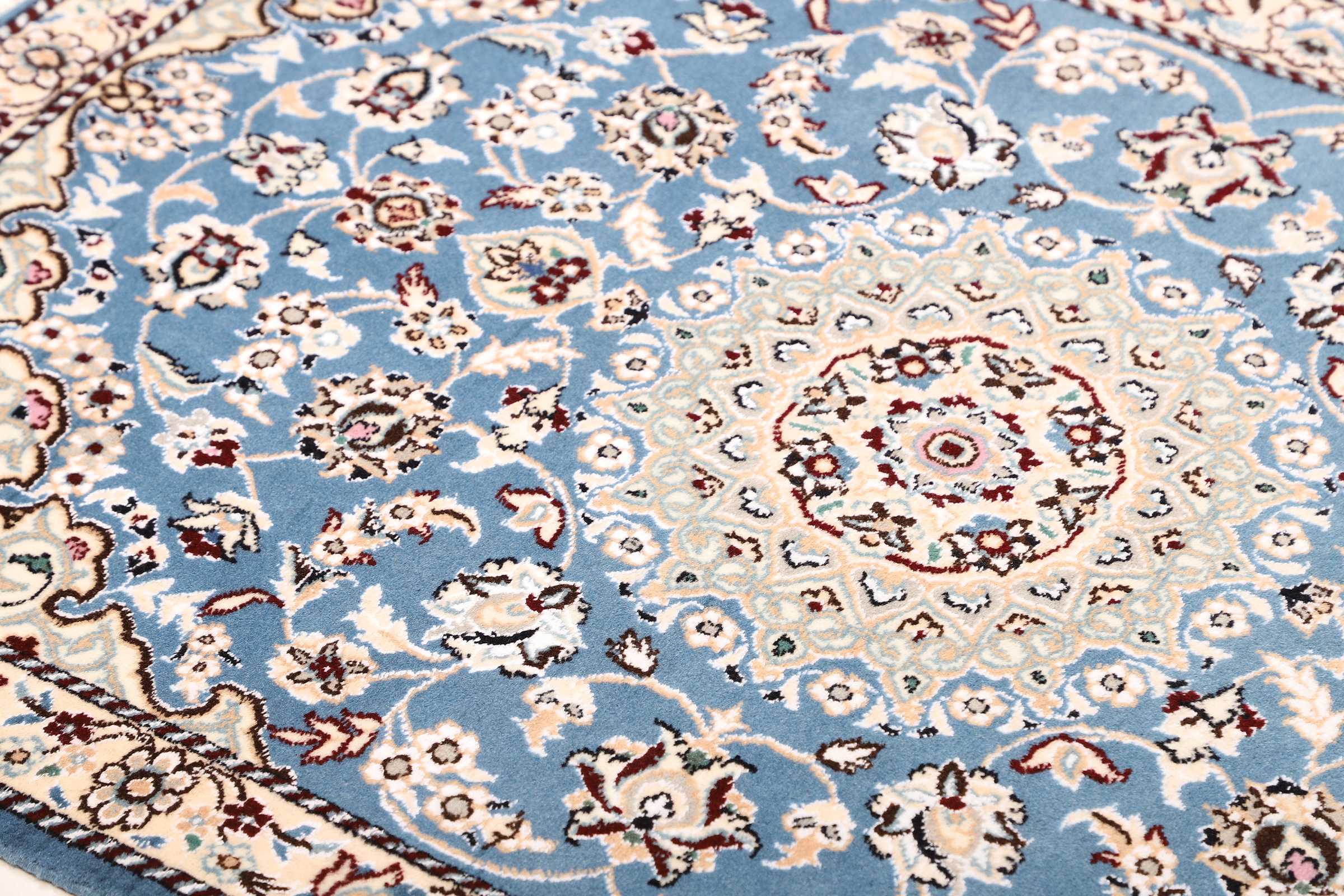 Nain carpets are high-quality Persian rugs woven in the Nain region of Iran. Known for their intricate designs, these carpets feature fine details, often incorporating floral and medallion patterns. Made from premium wool or silk, Nain carpets are prized for their elegance, durability, and smooth texture.