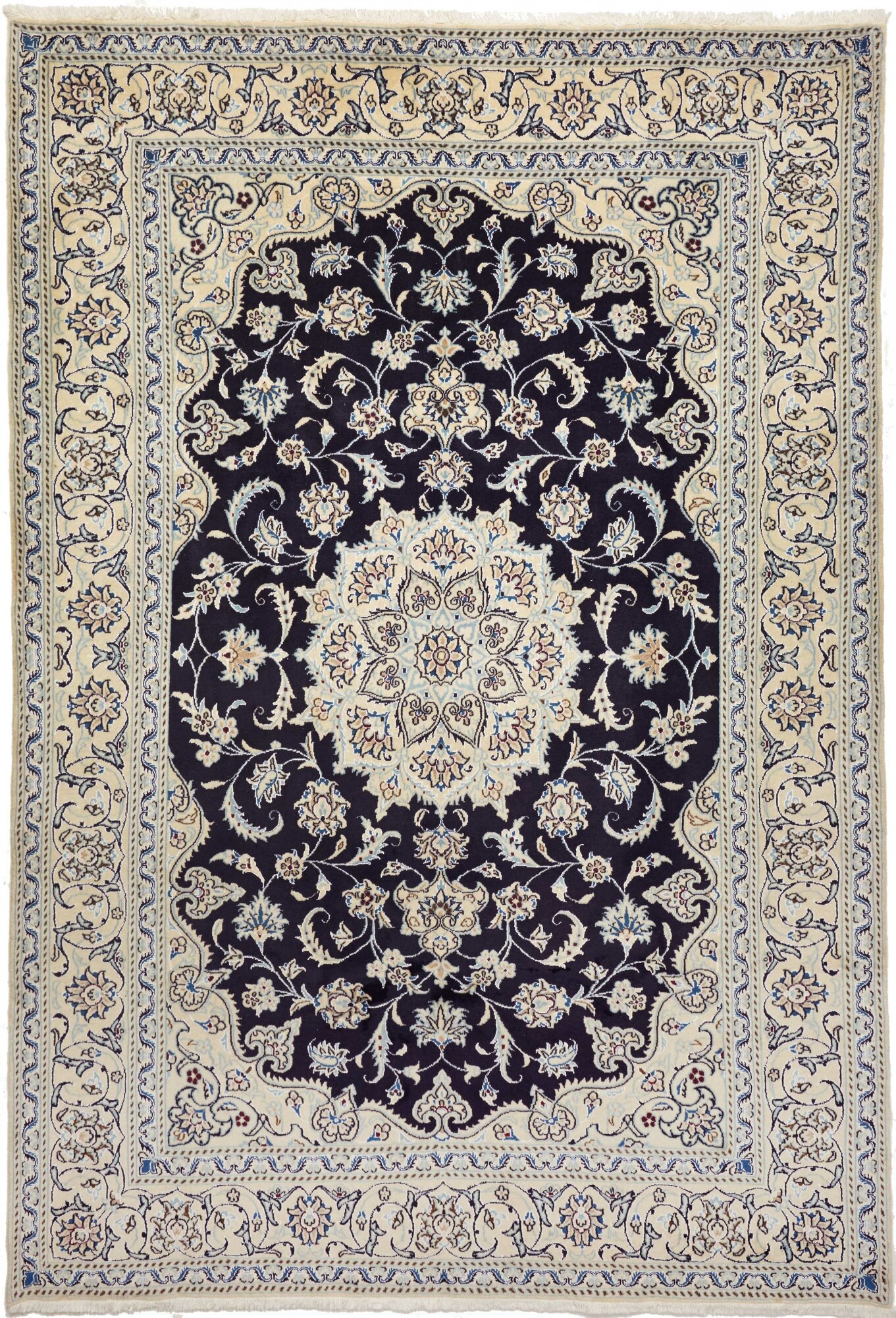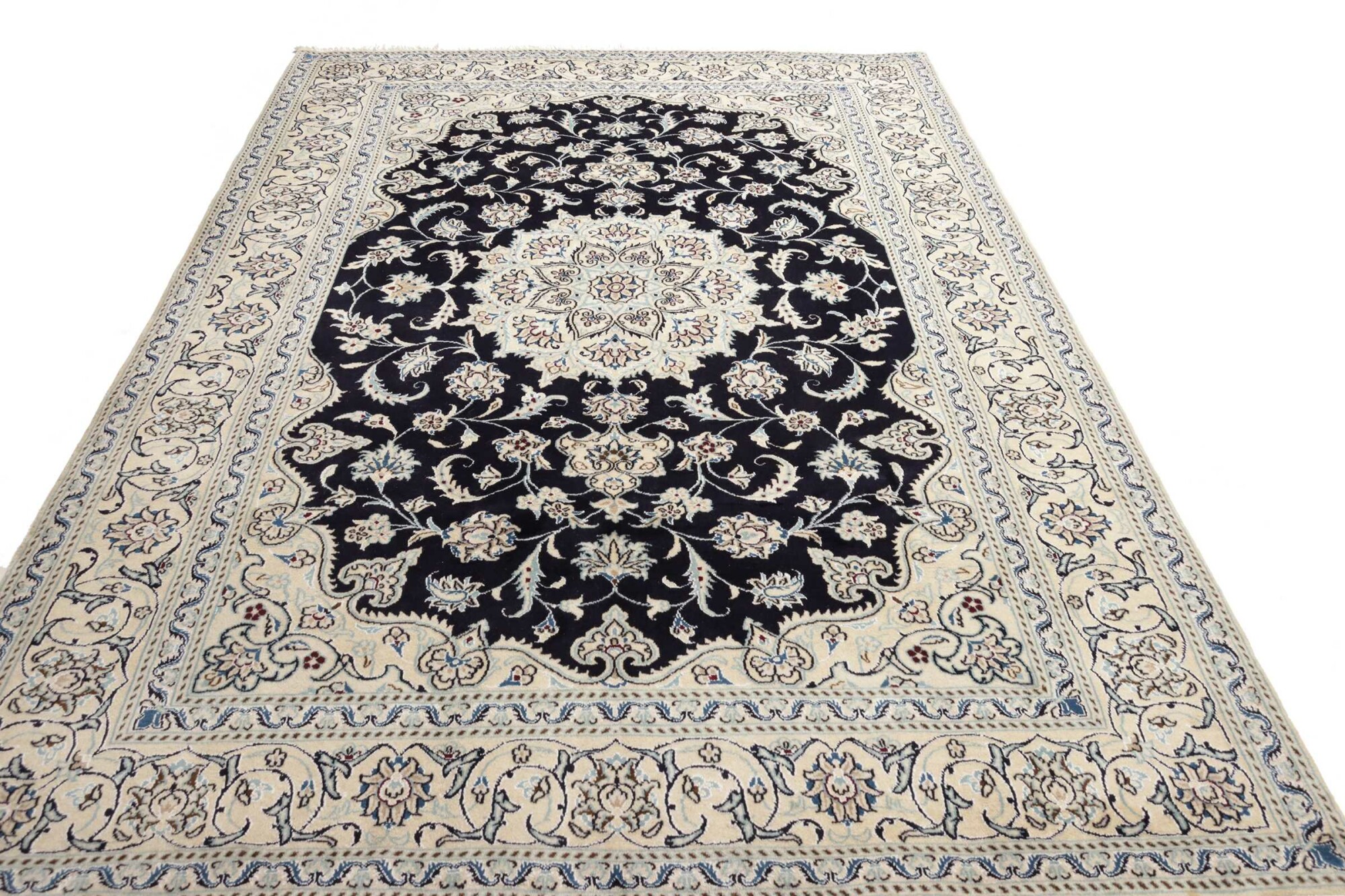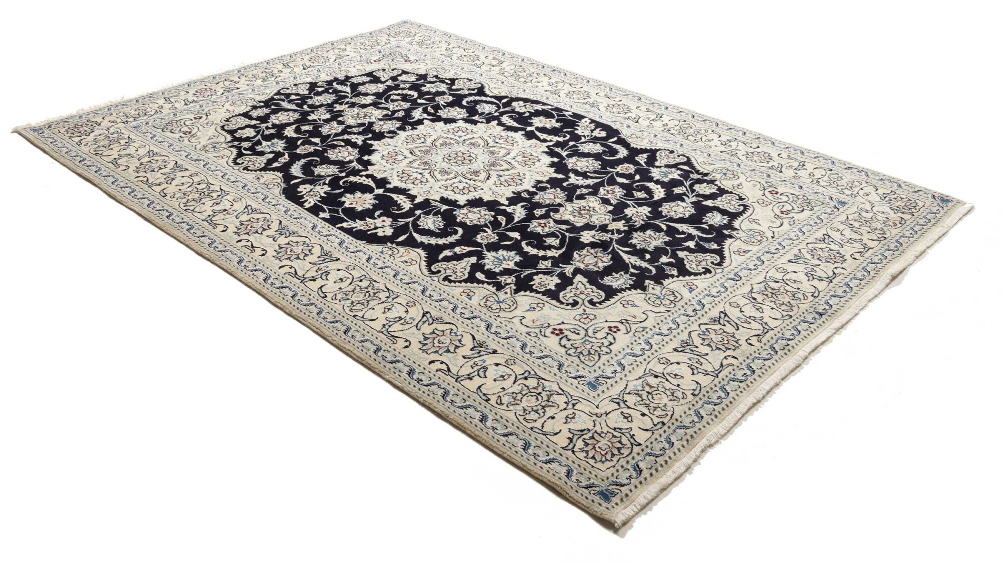 Nain carpets are high-quality Persian rugs woven in the Nain region of Iran. Known for their intricate designs, these carpets feature fine details, often incorporating floral and medallion patterns. Made from premium wool or silk, Nain carpets are prized for their elegance, durability, and smooth texture.